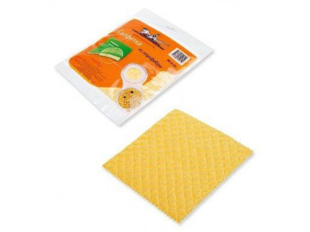 Салфетка из порофибры представляет сочетание двух материалов в одном изделии. Мягкий и обильно впитывающий влагу поролон соединен с микрофибровой тканью, которая гладко устраняет грязь с поверхности, устраняя разводы и не оставляя следов ворса. Изделие имеет плотную текстуру и прямоугольную форму размером 18?20 см. Поверхность изделия окрашена в ярко-желтый цвет.