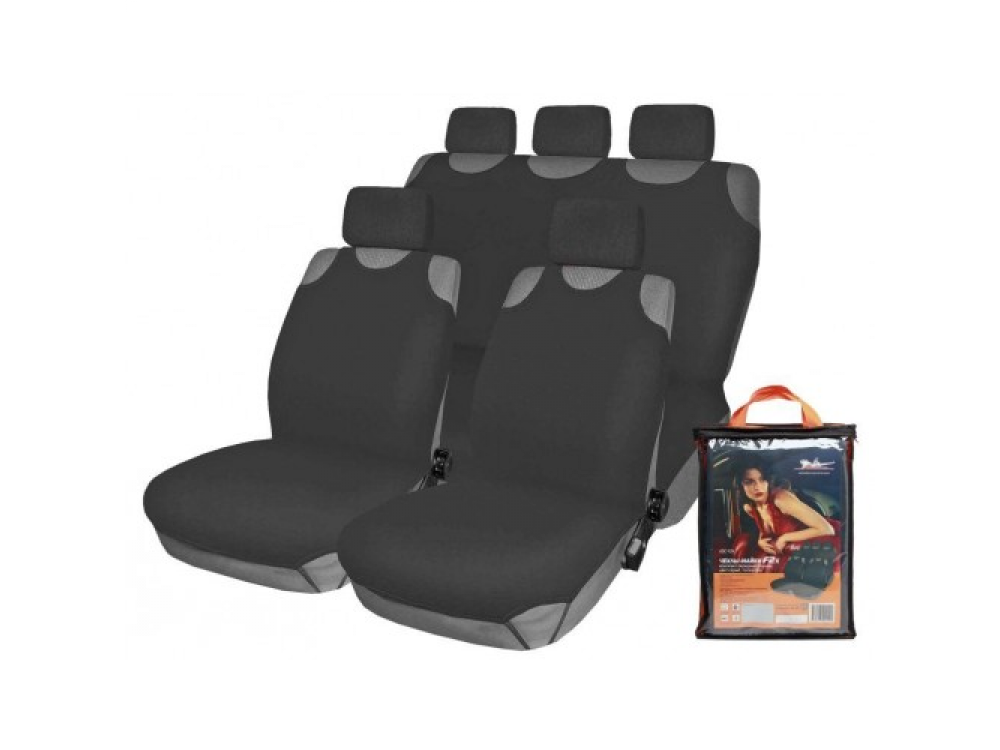 Комплект чехлов-маек F-2K предназначен для установки на передние и задние сиденья автомобиля. Комплект выполнен в темно-сером цвете. Специально разработанная форма чехлов позволяет закрывать только наиболее часто используемую поверхность сидений автомобиля. Благодаря особой форме, чехлы не препятствуют работе подушек безопасности, а также легко устанавливаются на сиденья машины.