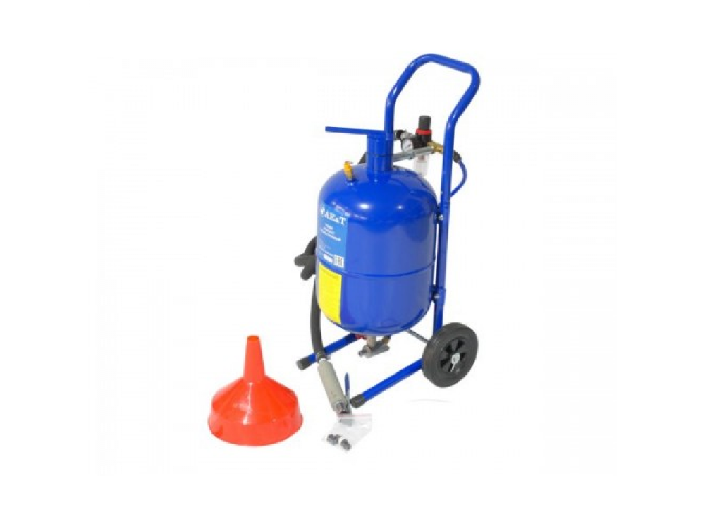 Компактный пескоструйный аппарат T06505 AE&T напорного типа с резервуаром емкостью 19л оборудован керамическим соплом и запорным клапаном, манометром, 2.5м шлангом, воронкой, влагоотделителем, 6" резиновыми колесами.