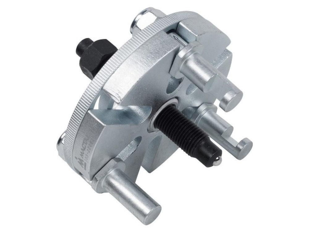 Съемник шестерни привода ГРМ МАСТАК 103-22082 предназначен для демонтажа шестерен и шкивов. Специальная конструкция позволяет применять съёмник для шестерен и шкивов разных диаметров и конфигураций. Особенности: - Диапазон регулировки захватов: от 42 до 82 мм - Материал корпуса: хромированная сталь - Центральный силовой болт: углеродистая сталь, оксидированное покрытие - Кратность прорезей (шлицов, канавок) шкива: 3, 6, 9.